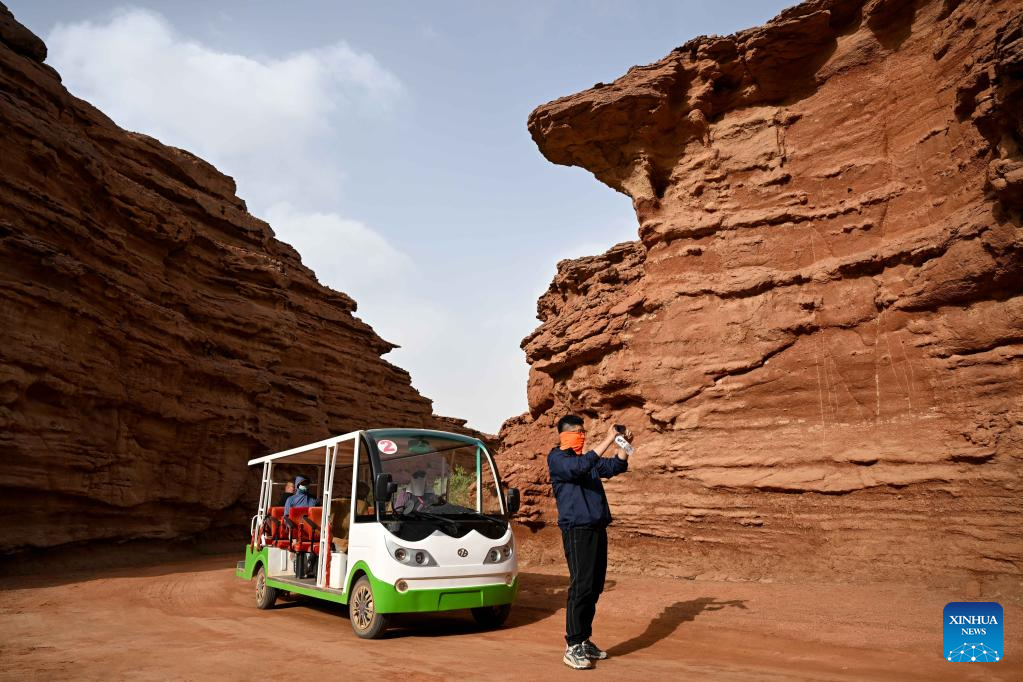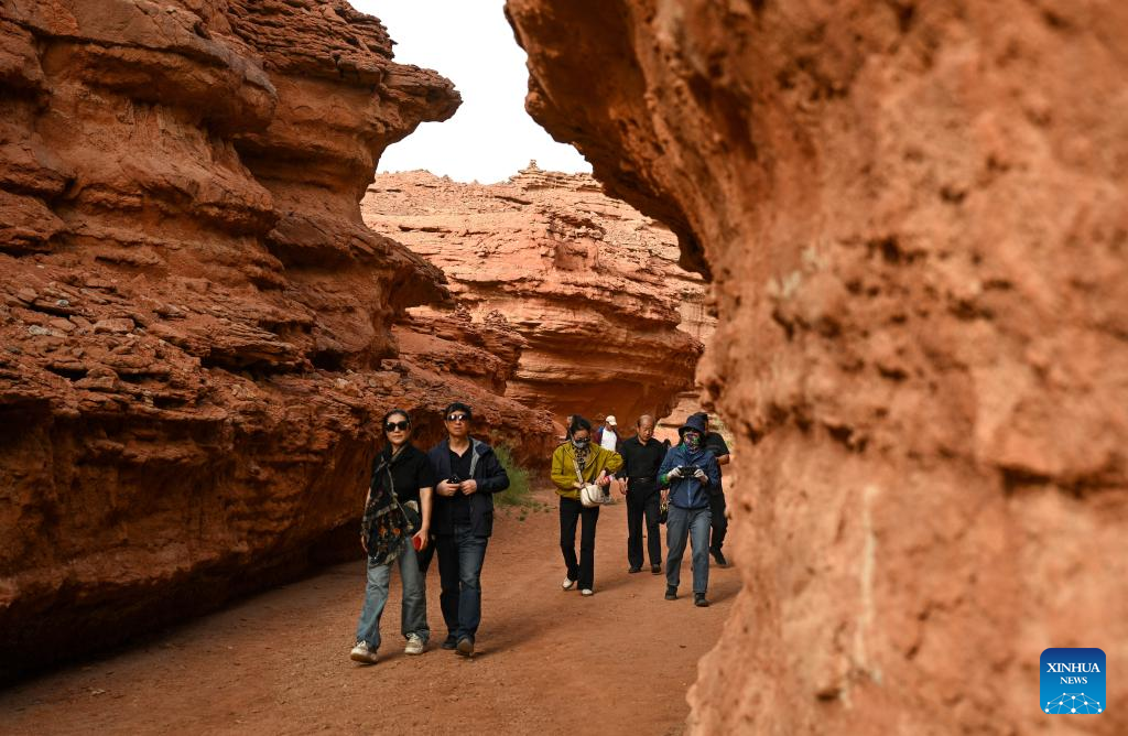Tourists visit the West Dreamy Canyon in Alxa, north China's Inner Mongolia Autonomous Region, May 13, 2023. (Xinhua/Bei He)
