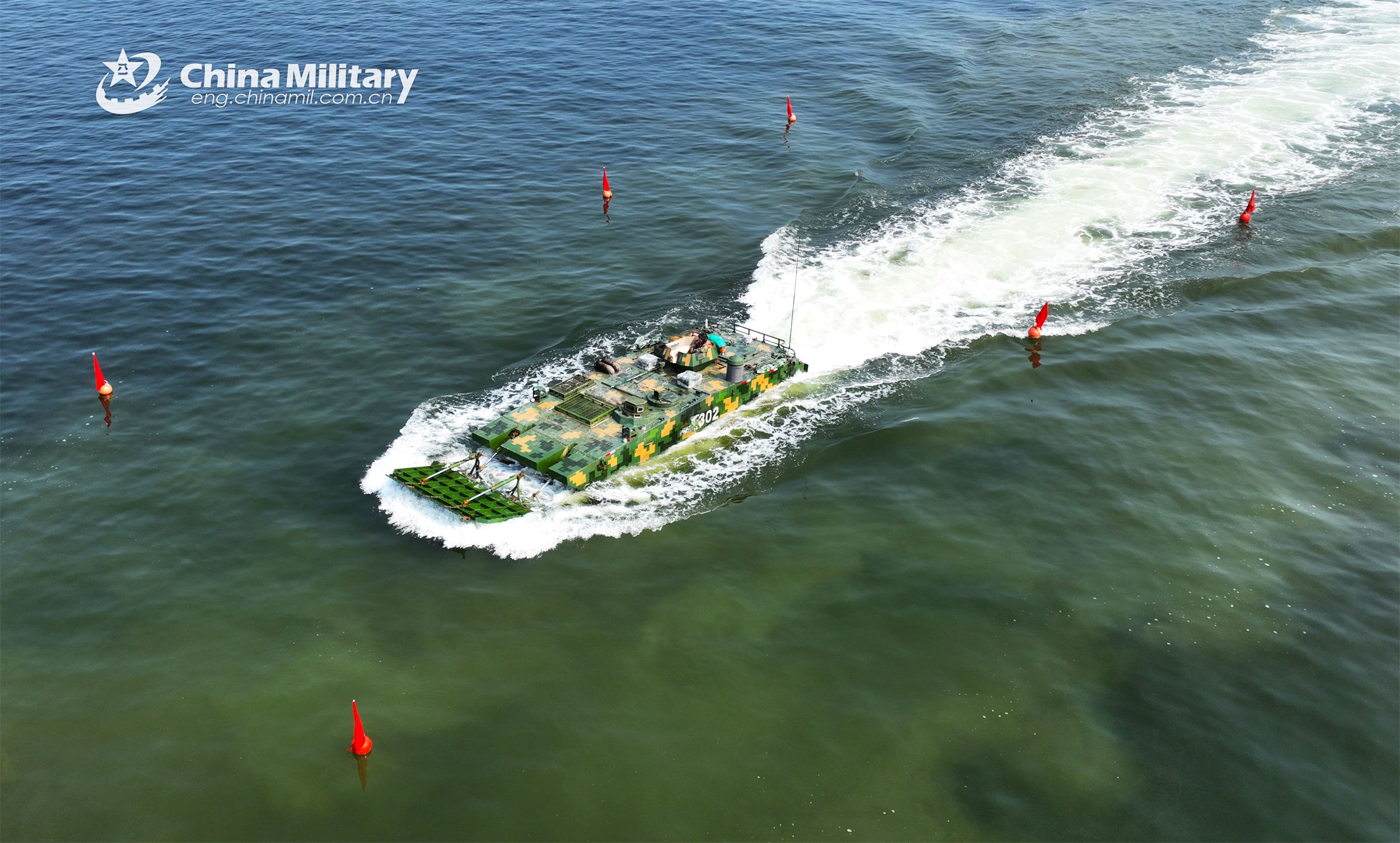 An amphibious armored vehicle attached to a brigade of the PLA 73rd Group Army makes its way during a maritime driving training exercise in late April, 2023. (eng.chinamil.com.cn/Photo by Zheng Yi)