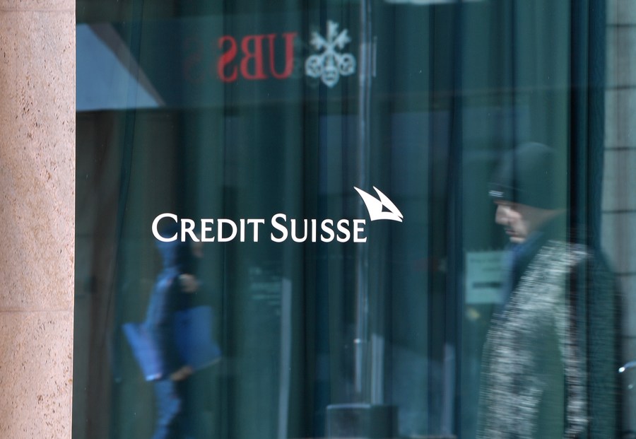 Passersby are reflected in the window of a building of Credit Suisse in Geneva, Switzerland, April 4, 2023. (Xinhua/Lian Yi)