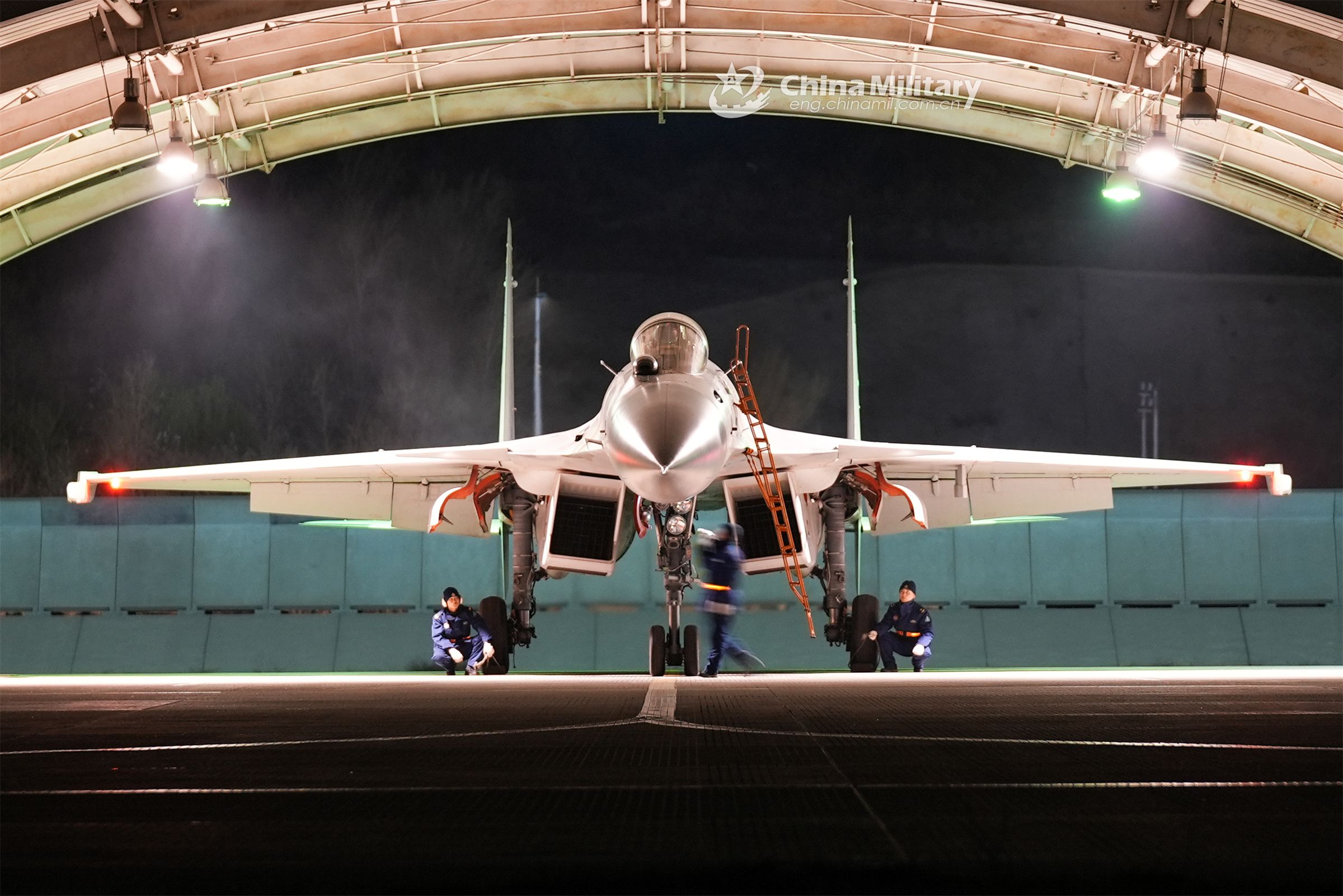 Several ground crew members assigned to a regiment under the PLA Naval Aviation University inspect the fighter jet prior to the round-the-clock flight training recently. (eng.chinamil.com.cn/Photo by Ni Shuai)