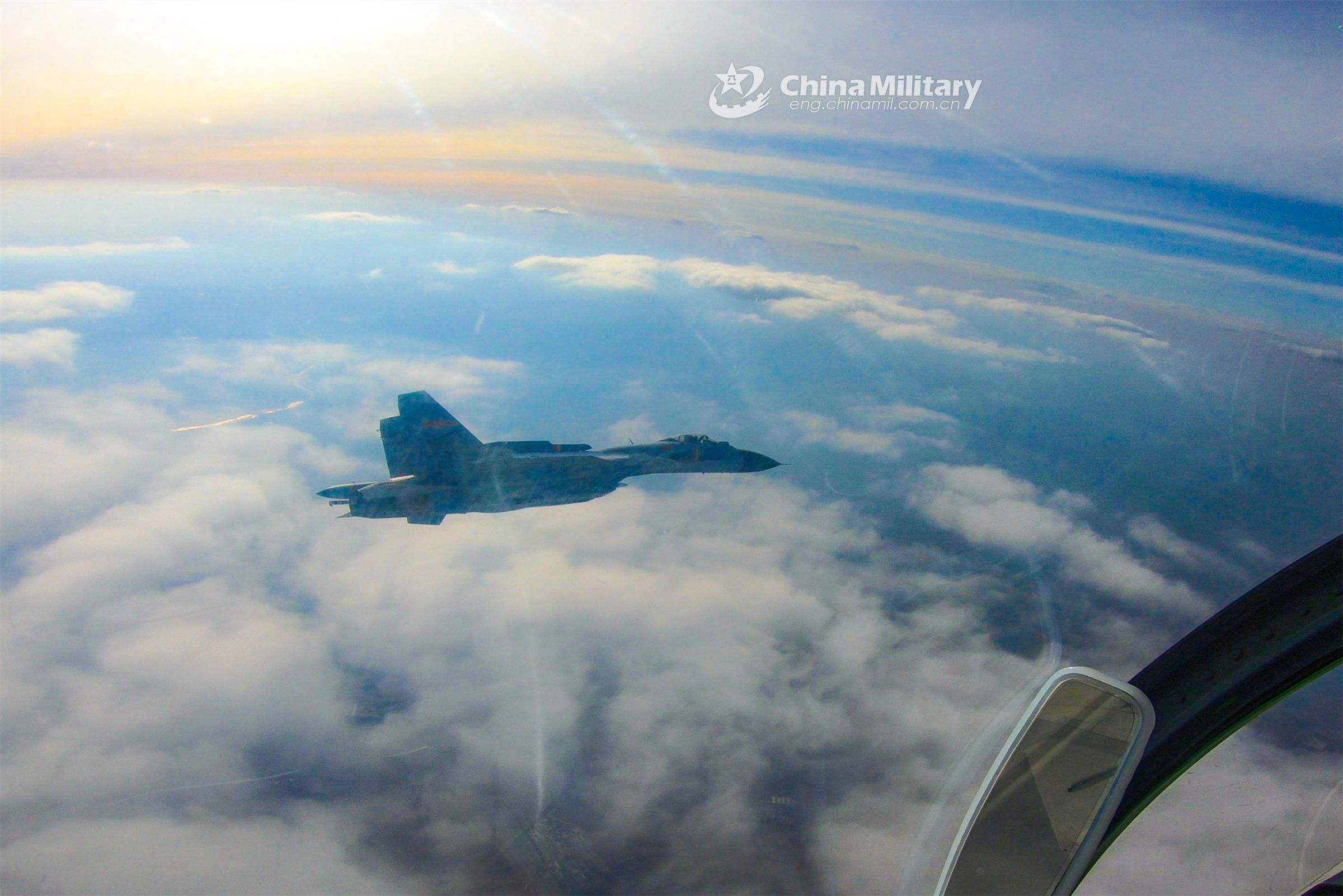 Fighter jets attached to a regiment under the PLA Naval Aviation University fly in formation during the round-the-clock flight training recently. (eng.chinamil.com.cn/Photo by Ni Shuai)