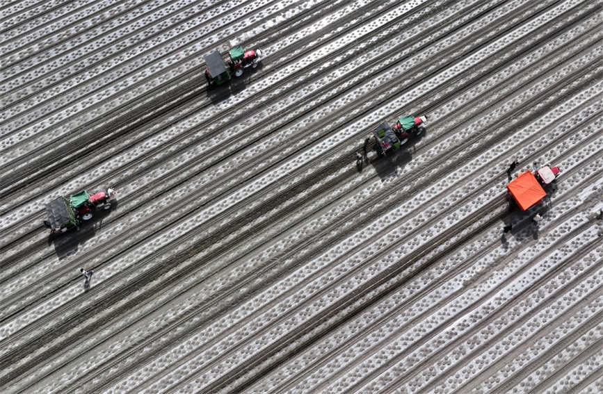 Pepper seedling transplanter machines work in a field in Baoerhai village, Yanqi Hui Autonomous County, Bayingolin Mongolian Autonomous Prefecture of northwest China's Xinjiang Uygur Autonomous Region. (Photo/Que Hure)