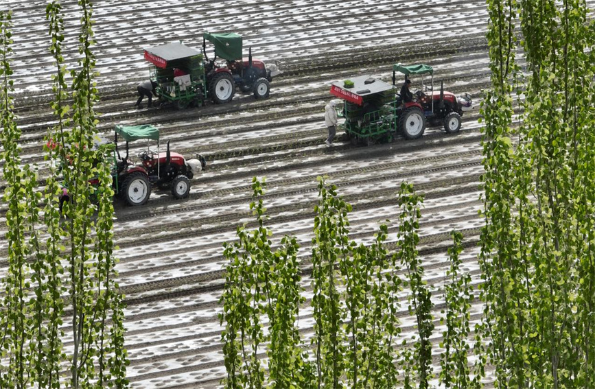 Pepper seedling transplanter machines work in a field in Baoerhai village, Yanqi Hui Autonomous County, Bayingolin Mongolian Autonomous Prefecture of northwest China's Xinjiang Uygur Autonomous Region. (Photo/Que Hure)