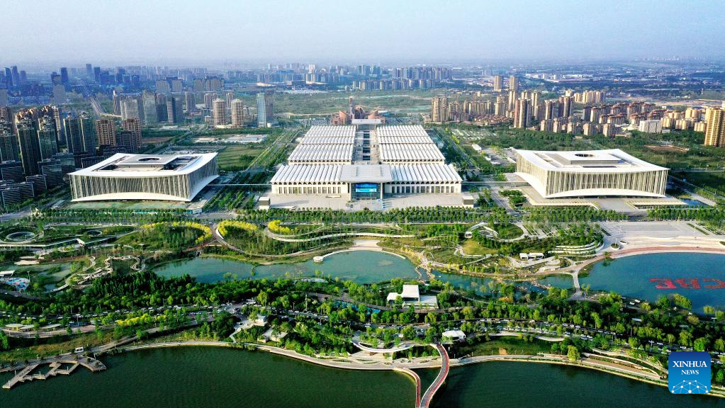 This aerial photo taken on April 16, 2023 shows the Xi'an international convention and exhibition center at the Chanba ecological zone in Xi'an, northwest China's Shaanxi Province. (Xinhua/Liu Xiao)