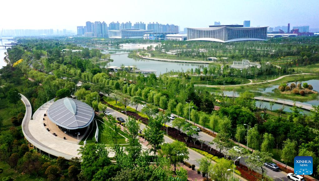This aerial photo taken on April 16, 2023 shows a view of the Xi'an international convention center at the Chanba ecological zone in Xi'an, northwest China's Shaanxi Province. (Xinhua/Liu Xiao)