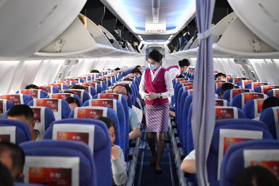 Flight attendants conduct safety inspections before the first passenger flight of the Xi'an-Urumqi-Ashgabat route takes off in Xi'an, northwest China's Shaanxi Province, May 13, 2023. (Xinhua/Shao Rui)