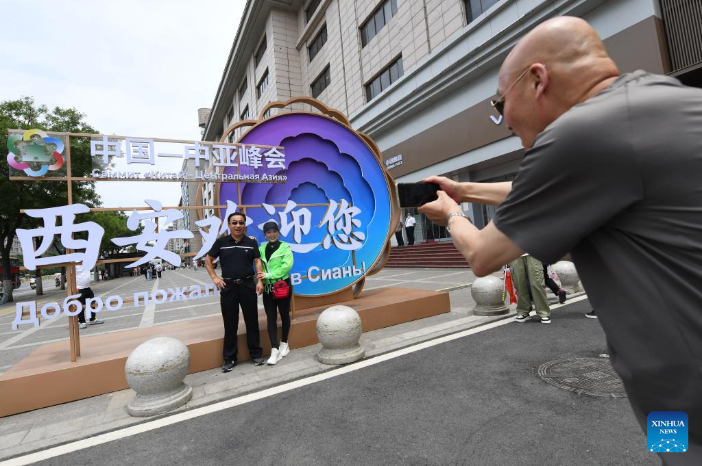 Tourists take photos with an installation of the China-Central Asia Summit in Xi'an, northwest China's Shaanxi Province, May 16, 2023. The China-Central Asia Summit is set to take place in Xi'an, the capital city of China's Shaanxi Province, on May 18 and 19. (Xinhua/Li Yibo)