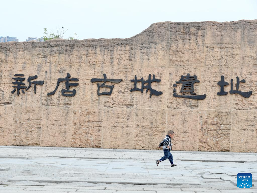 A child has fun in front of the wall of the Xindian ancient city heritage site park in Fuzhou, southeast China's Fujian Province, May 16, 2023. Fujian Museum in Fujian Province will be the country's main venue for this year's International Museum Day, which falls on May 18. A number of featured exhibitions, seminars, dialogues and events will take place at museums around Fujian province. (Xinhua/Jiang Kehong)