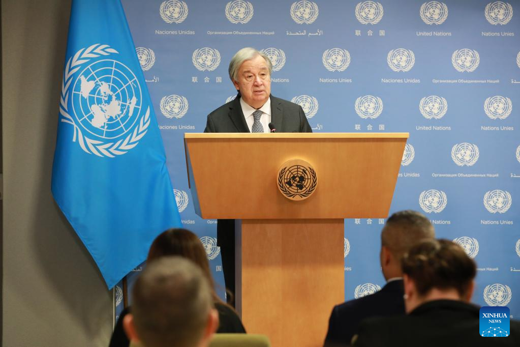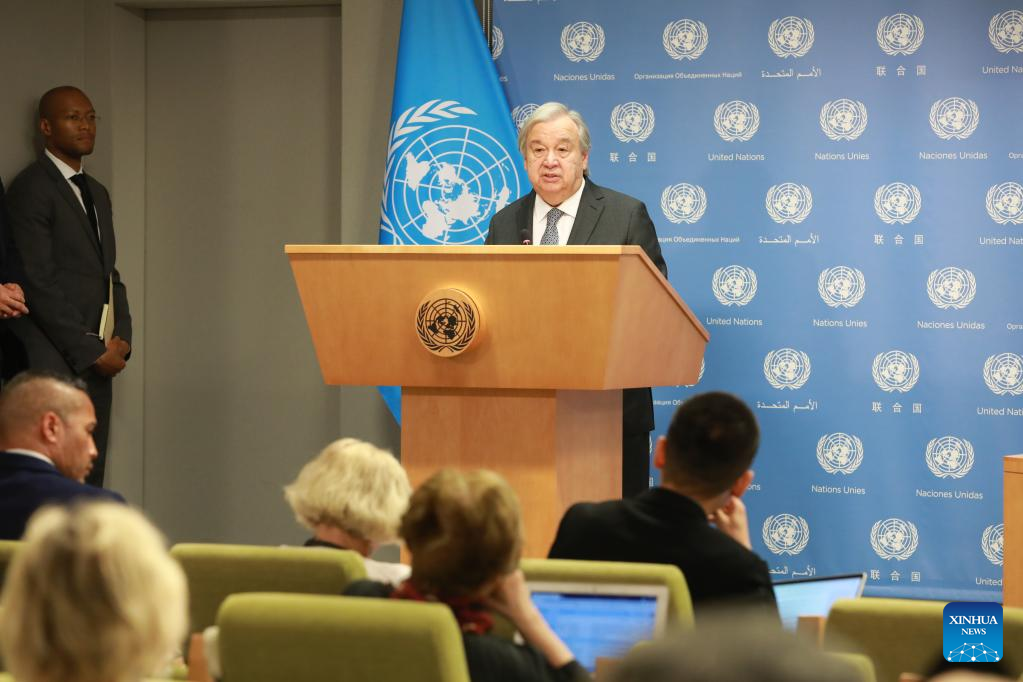 UN Secretary-General Antonio Guterres speaks at a press conference on the extension of the Black Sea Grain Initiative at the UN headquarters in New York, on May 17, 2023. Guterres on Wednesday welcomed Russia's decision that would allow the extension of the Black Sea Grain Initiative, which allows the export of Ukrainian grain and other agricultural products from Black Sea ports. (Xinhua/Xie E)
