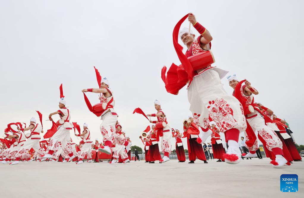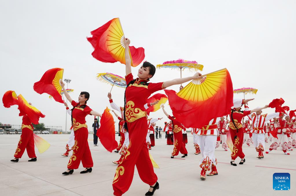 Shaanxi folk dancers perform during a welcoming ceremony for Kyrgyz President Sadyr Japarov in Xi'an, northwest China's Shaanxi Province, on May 17, 2023. Kyrgyz President Sadyr Japarov arrived in Xi'an, northwest China's Shaanxi Province, late Wednesday afternoon for the China-Central Asia Summit, which is scheduled for May 18 and 19. (Xinhua/Xing Guangli)