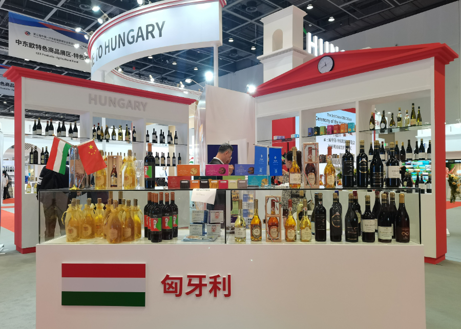 This photo taken on May 16, 2023 shows Hungarian wines at the China-Central & Eastern European Countries (CEEC) Expo in Ningbo, east China's Zhejiang Province. Distinctive commodities from Central and Eastern European countries, especially agricultural food, wines, and dairy products, have drawn wide attention at the expo. (Xinhuanet/Zhang Qian)