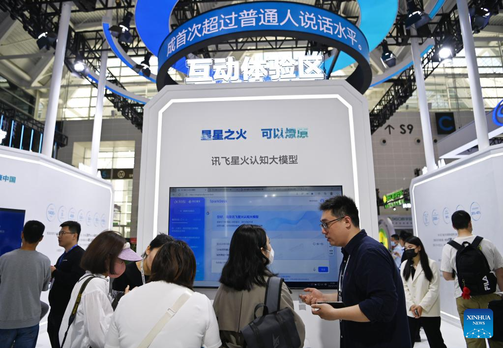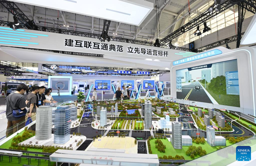 People visit an intelligent technology exhibition during the seventh World Intelligence Congress (WIC) in north China's Tianjin, May 18, 2023. The seventh WIC, a major AI event in China, kicked off in the northern Tianjin Municipality on Thursday. (Xinhua/Zhao Zishuo)