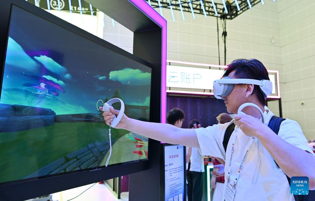 A man visits an intelligent technology exhibition during the seventh World Intelligence Congress (WIC) in north China's Tianjin, May 18, 2023. The seventh WIC, a major AI event in China, kicked off in the northern Tianjin Municipality on Thursday. (Xinhua/Li Ran)