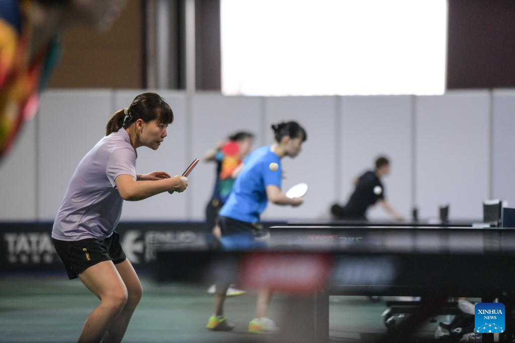 Chen Xingtong (1st L) of China attends a training session for the 2023 ITTF Table Tennis World Championships Finals in Durban, South Africa, May 18, 2023. (Xinhua/Han Xu)