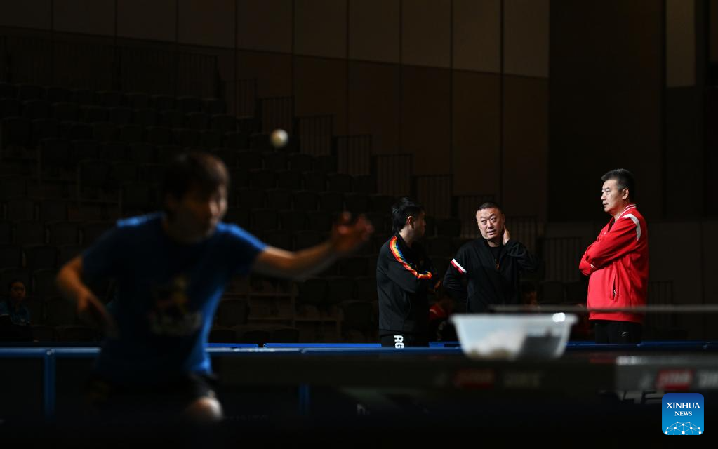China's table tennis team chief coach Li Sun (1st R) and women's head coach Ma Lin (2nd R) are seen during a training session for the 2023 ITTF Table Tennis World Championships Finals in Durban, South Africa, May 18, 2023. (Xinhua/Tao Xiyi)