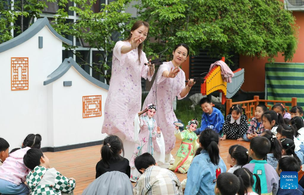 Children interact with puppets at a kindergarten in Qidu Town, Wujiang District of Suzhou City, east China's Jiangsu Province, April 20, 2023. Kunqu, with a history of hundreds of years, is listed by the United Nations Educational, Scientific and Cultural Organization (UNESCO) as an intangible cultural heritage in 2001. (Xinhua/Yang Lei)