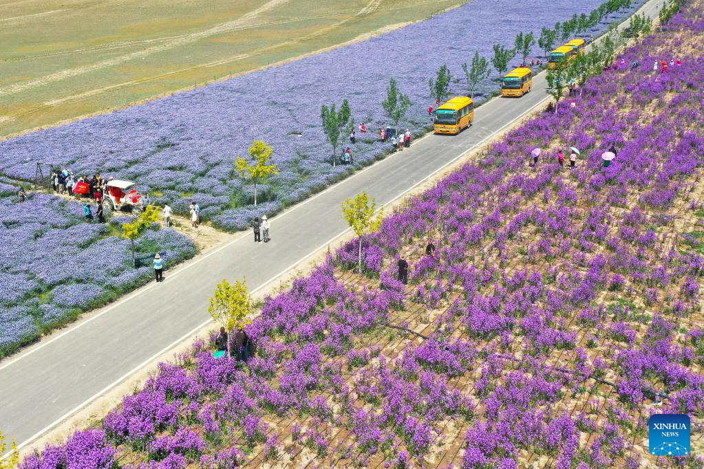 This photo taken on May 17, 2023 shows a view of a scenic spot in Huocheng County in Ili Kazak Autonomous Prefecture, northwest China's Xinjiang Uygur Autonomous Region. Ili Kazak Autonomous Prefecture has developed flowers sightseeing economy in recent years, which boosts the local tourism, attracts lots of visitors and increases the income of local people. (Xinhua/Ding Lei)