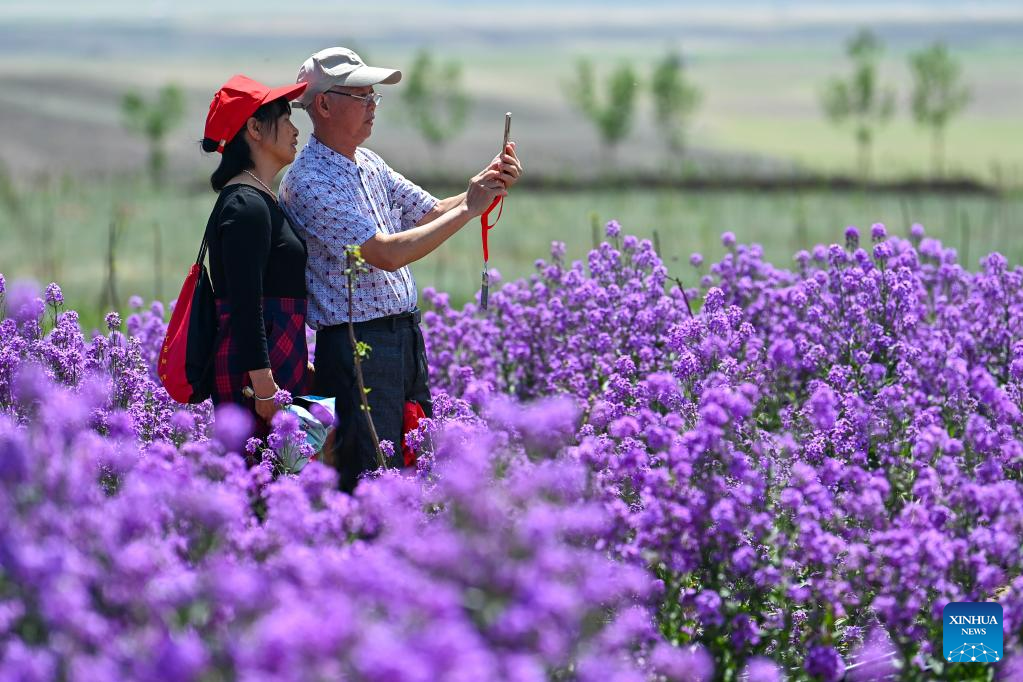 Visitors take photos of flowers at a flower sea agricultural industrial park in Yining County, Ili Kazak Autonomous Prefecture, northwest China's Xinjiang Uygur Autonomous Region, May 18, 2023. Ili Kazak Autonomous Prefecture has developed flowers sightseeing economy in recent years, which boosts the local tourism, attracts lots of visitors and increases the income of local people. (Xinhua/Ding Lei)