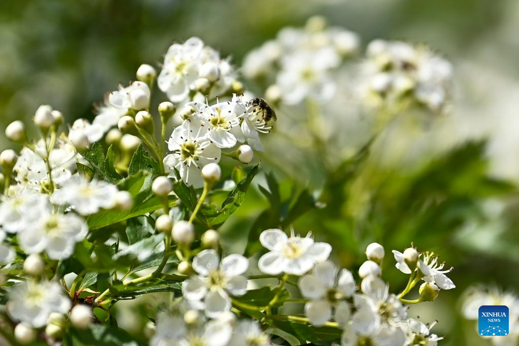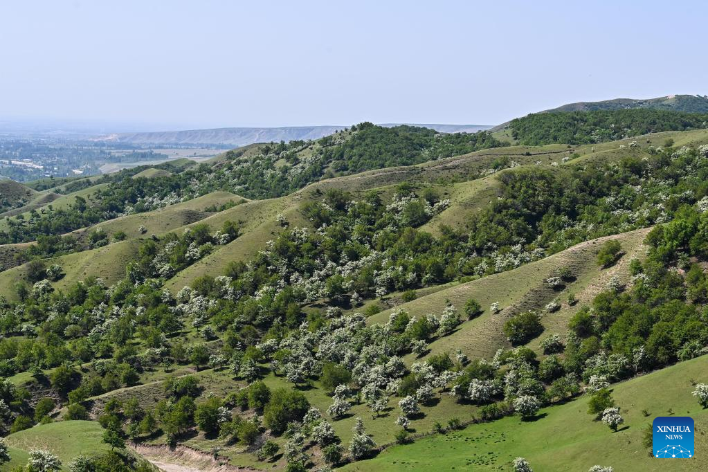 This photo taken on May 17, 2023 shows wild may blossom at a scenic spot in Huocheng County in Ili Kazak Autonomous Prefecture, northwest China's Xinjiang Uygur Autonomous Region. Ili Kazak Autonomous Prefecture has developed flowers sightseeing economy in recent years, which boosts the local tourism, attracts lots of visitors and increases the income of local people. (Xinhua/Ding Lei)