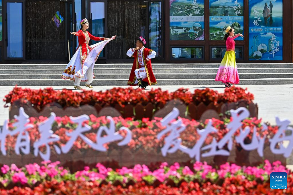 Staff members perform a dance to greet visitors at a flower sea agricultural industrial park in Yining County, Ili Kazak Autonomous Prefecture, northwest China's Xinjiang Uygur Autonomous Region, May 18, 2023. Ili Kazak Autonomous Prefecture has developed flowers sightseeing economy in recent years, which boosts the local tourism, attracts lots of visitors and increases the income of local people. (Xinhua/Ding Lei)