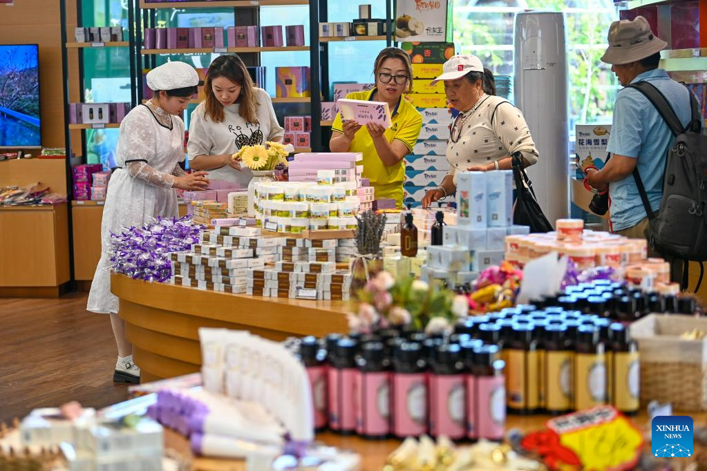 Visitors select goods at a flower sea agricultural industrial park in Yining County, Ili Kazak Autonomous Prefecture, northwest China's Xinjiang Uygur Autonomous Region, May 18, 2023. Ili Kazak Autonomous Prefecture has developed flowers sightseeing economy in recent years, which boosts the local tourism, attracts lots of visitors and increases the income of local people. (Xinhua/Ding Lei)