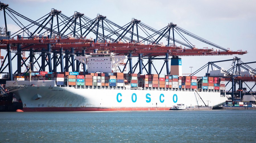 A cargo ship of COSCO Shipping Lines docks in Dutch Port of Rotterdam, April 20, 2013. (Xinhua/Jia Lirui)