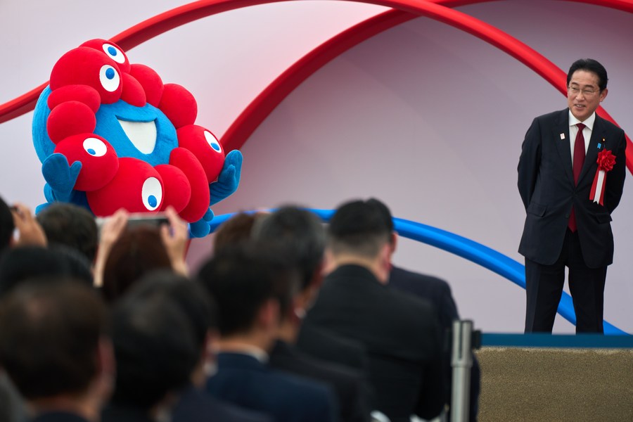 Japanese Prime Minister Fumio Kishida attends the ceremony of the venue for World Expo 2025 at Osaka's Yumeshima artificial island in Osaka, Japan, April 13, 2023. (Xinhua/Zhang Xiaoyu)