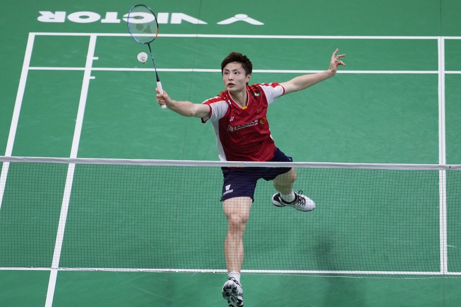 Shi Yuqi of China in action during his men's singles match against Naraoka Kodai of Japan in the semifinal between China and Japan at BWF Sudirman Cup in Suzhou, east China's Jiangsu Province, May 20, 2023. (Xinhua/Li Bo)