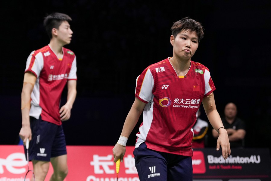 Feng Yanzhe/Huang Dongping (R) of China react during their mixed doubles match against Yamashita Kyohei/Shinoya Naru of Japan in the semifinal between China and Japan at BWF Sudirman Cup in Suzhou, east China's Jiangsu Province, May 20, 2023. (Xinhua/Li Bo)