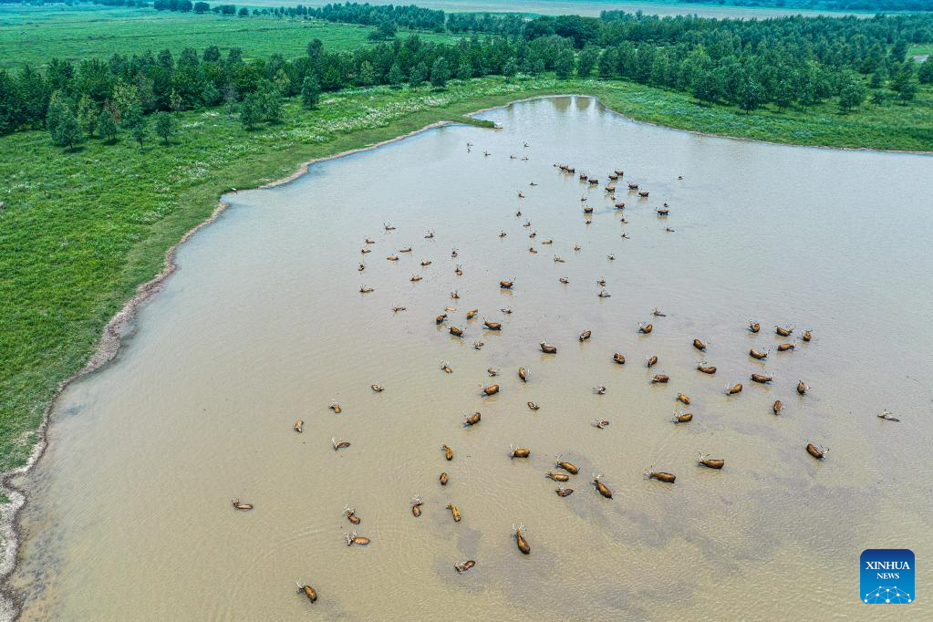 This photo taken on May 19, 2023 shows milu deer at Shishou Milu Deer National Nature Reserve in central China's Hubei Province. After years of efforts by protectors and continuous improvement of the local ecological environment, the population of milu deer at the nature reserve has increased rapidly. (Xinhua/Hui Xiaoyong)