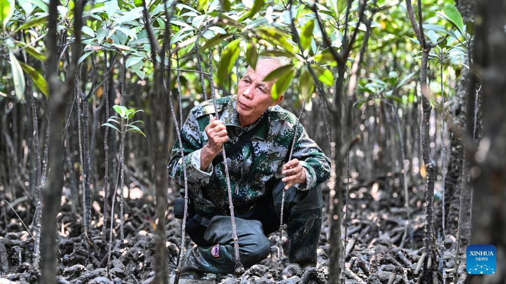 Mo Jirui checks mangrove seedlings in Shankou Mangrove Nature Reserve in Hepu County of Beihai City, south China's Guangxi Zhuang Autonomous Region, May 20, 2023. (Xinhua/Zhang Ailin)