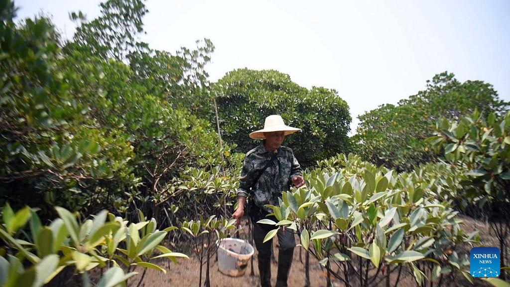 Mo Jirui cultivates mangrove seeds in Shankou Mangrove Nature Reserve in Hepu County of Beihai City, south China's Guangxi Zhuang Autonomous Region, May 20, 2023. (Xinhua/Zhang Ailin)