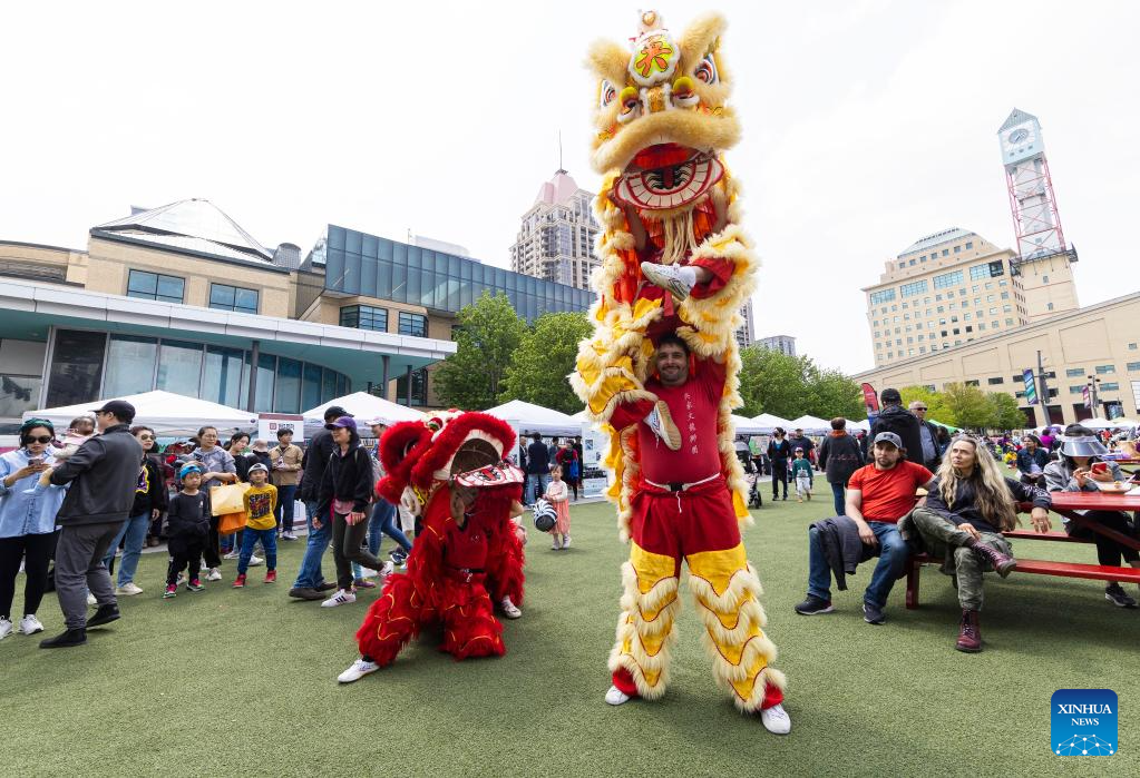 Lion dancers perform during the Chinese Culture Festival in Mississauga, the Greater Toronto Area, Canada, on May 20, 2023. Lion dances, operas, traditional wedding shows were displayed at the annual event. (Photo by Zou Zheng/Xinhua)