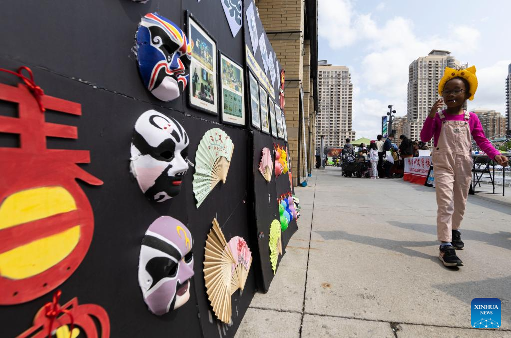 A girl looks at an exhibition during the Chinese Culture Festival in Mississauga, the Greater Toronto Area, Canada, on May 20, 2023. Lion dances, operas, traditional wedding shows were displayed at the annual event. (Photo by Zou Zheng/Xinhua)