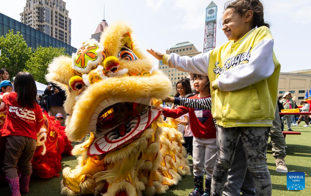 Children interact with lion dancers during the Chinese Culture Festival in Mississauga, the Greater Toronto Area, Canada, on May 20, 2023. Lion dances, operas, traditional wedding shows were displayed at the annual event. (Photo by Zou Zheng/Xinhua)