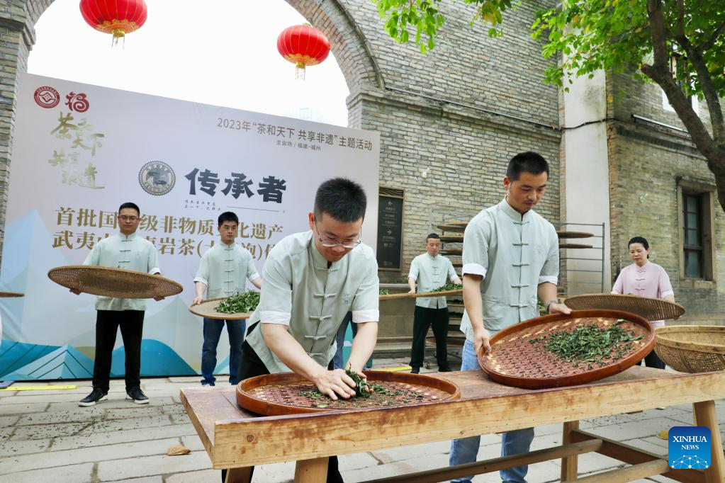 Staff show the making skills of Wuyi rock tea (Dahongpao) during a tea culture event held in Fuzhou, southeast China's Fujian Province, May 21, 2023. May 21 marks the International Tea Day. (Xinhua/Jiang Kehong)