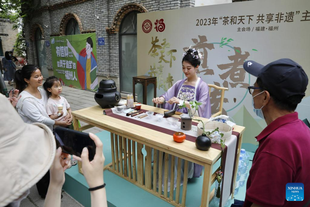 A staff member shows traditional tea art during a tea culture event held in Fuzhou, southeast China's Fujian Province, May 21, 2023. May 21 marks the International Tea Day. (Xinhua/Jiang Kehong)
