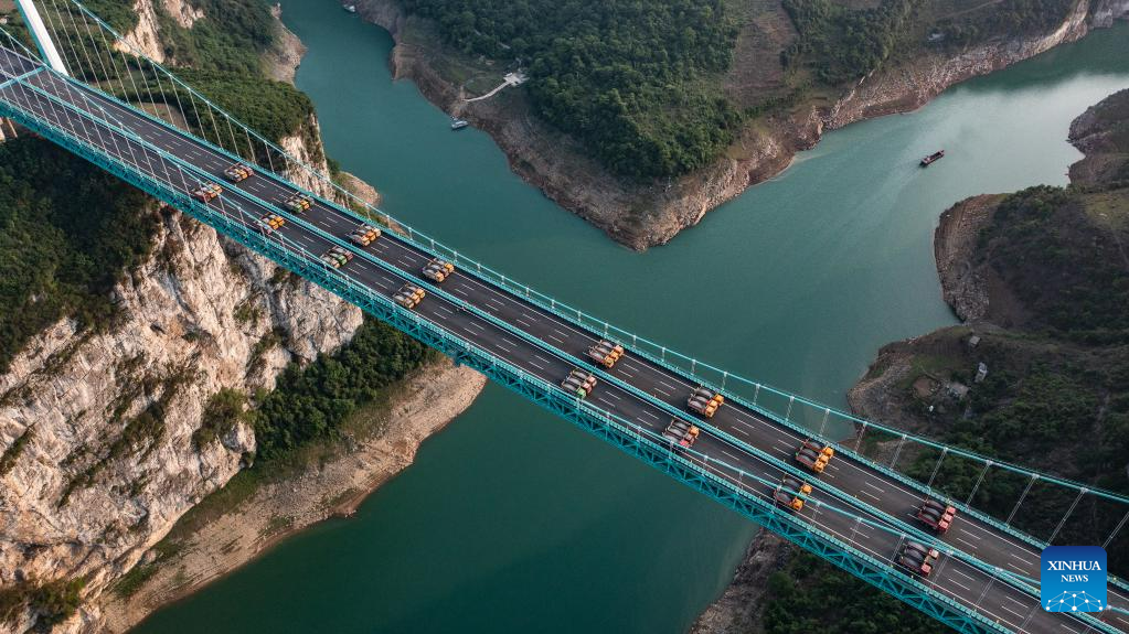 This aerial photo taken on May 21, 2023 shows the Jinfeng Wujiang River Bridge under static load testing in southwest China's Guizhou Province. Static load testing, including symmetrical and asymmetrical rounds, were conducted on the bridge Sunday. The bridge, which is 1473.5 meters in length, is a main project on the Guiyang-Jinsha-Gulin expressway. (Xinhua/Tao Liang)