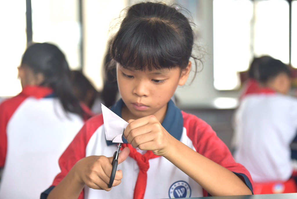 A girl cuts a piece of paper. (Photo/Lin Xiaodan)