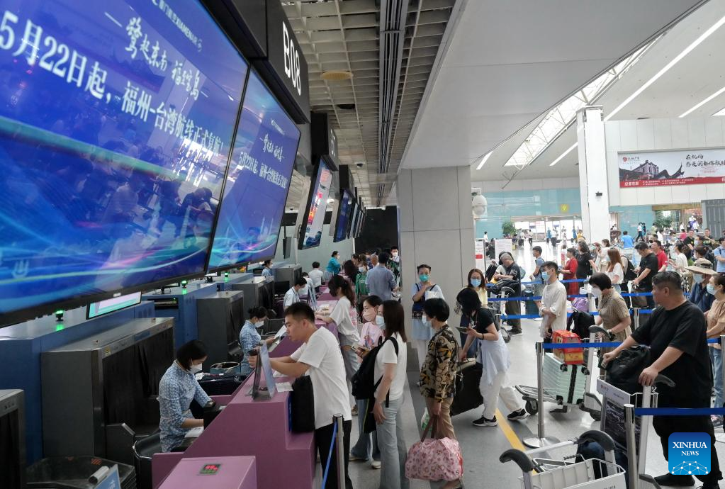 Passengers check in their luggage at the Fuzhou Changle International Airport in Fuzhou, capital of southeast China's Fujian Province, May 22, 2023. Direct flights between Taiwan and Fuzhou resumed on Monday after being suspended for over three years due to the pandemic. (Xinhua/Lin Shanchuan)