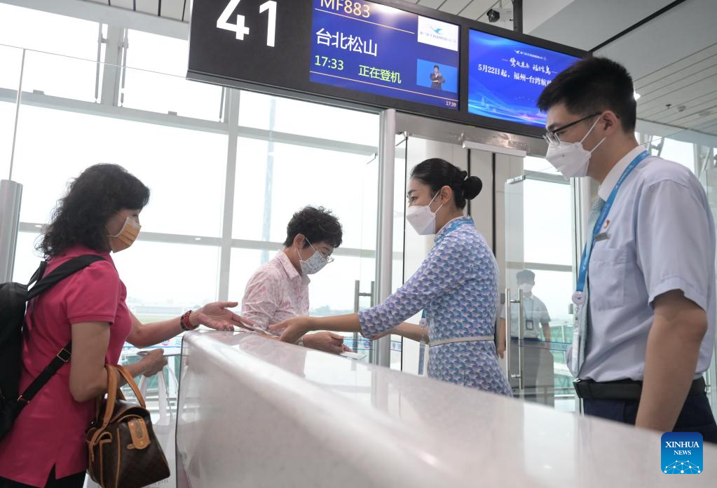 Passengers get their boarding passes checked before boarding the Flight MF883 at the Fuzhou Changle International Airport in Fuzhou, capital of southeast China's Fujian Province, May 22, 2023. Direct flights between Taiwan and Fuzhou resumed on Monday after being suspended for over three years due to the pandemic. (Xinhua/Lin Shanchuan)