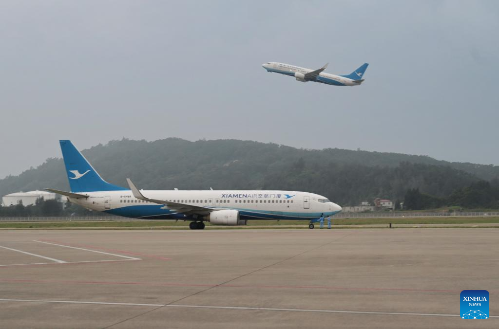 The Flight MF883 waits to take off at the Fuzhou Changle International Airport in Fuzhou, southeast China's Fujian Province, May 22, 2023. Direct flights between Taiwan and Fuzhou resumed on Monday after being suspended for over three years due to the pandemic. (Xinhua/Lin Shanchuan)