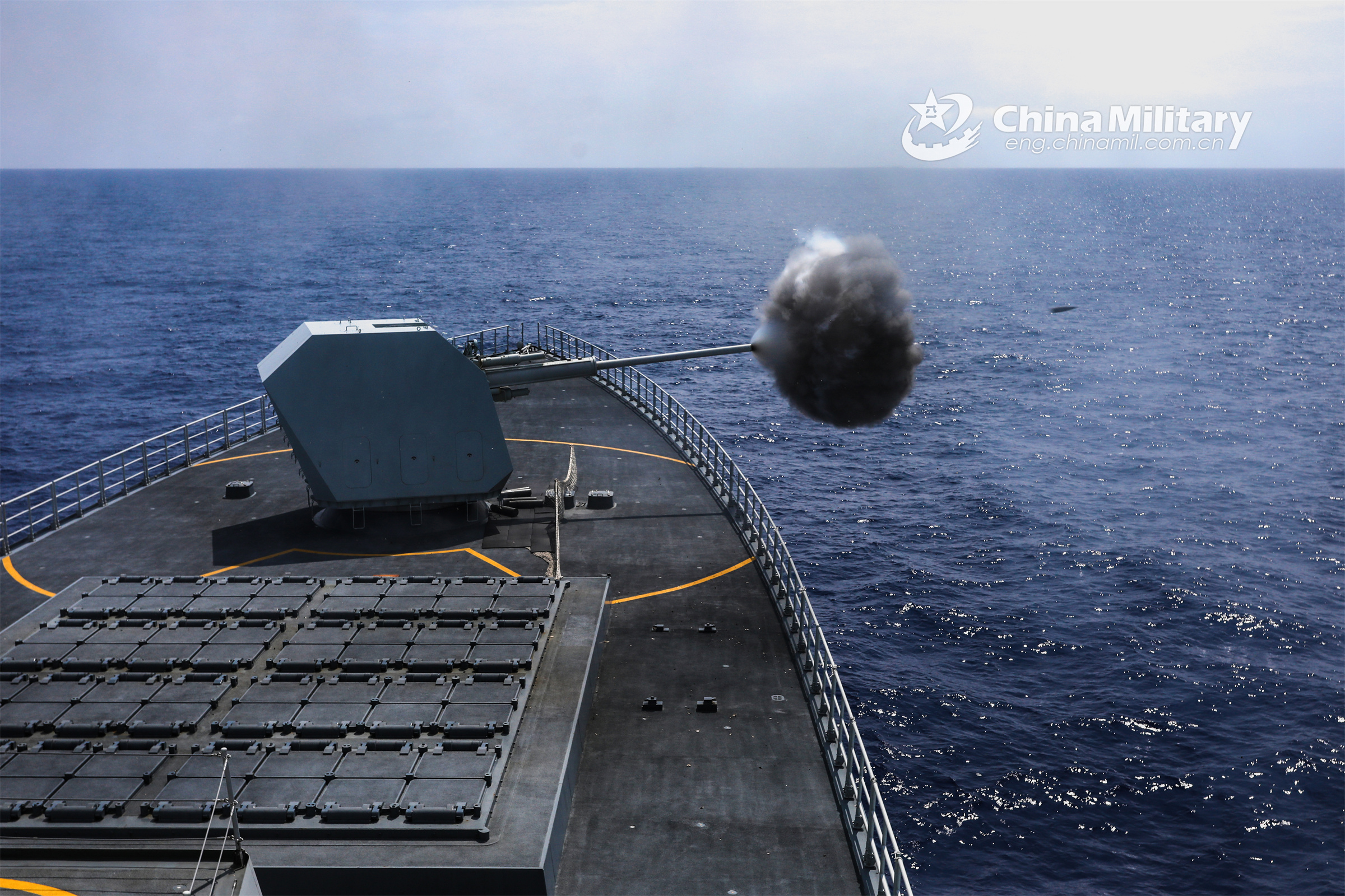 The guided-missile destroyer Dalian (Hull 105) attached the PLA Southern Theater Command fires its main gun at mock targets during a far-sea joint training drill in early April, 2023. (eng.chinamil.com.cn/Photo by Yang Yunxiang)