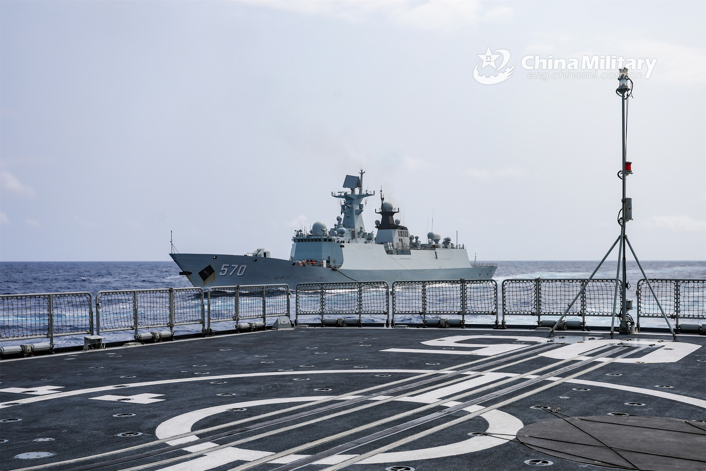 The frigate Huangshan (Hull 570) attached to the PLA Southern Theater Command sails in formation with the guided-missile destroyer Dalian (Hull 105) during a far-sea joint training drill in early April, 2023. (eng.chinamil.com.cn/Photo by Yang Yunxiang)