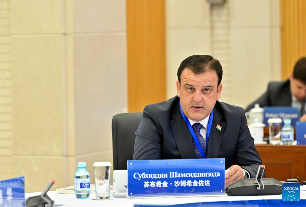 Subhiddin Shamsiddinzoda, head of the Khovar News Agency of Tajikistan, speaks at the China-Central Asia News Agency Forum, in Beijing, capital of China, May 23, 2023. A forum on strengthening collaboration among media outlets in China and Central Asian countries was held in Beijing on Tuesday. The China-Central Asia News Agency Forum, themed on "boosting media cooperation to promote the building of a China-Central Asia community with a shared future," was one of the achievements of the recently concluded China-Central Asia Summit. The forum was initiated and hosted by China's Xinhua News Agency and attended by heads and representatives of media outlets from five Central Asian countries, namely, the Television and Radio Complex of the President of the Republic of Kazakhstan, Kabar News Agency of Kyrgyzstan, Khovar News Agency of Tajikistan, Media Turkmen News Agency and Uzbekistan National News Agency. During the forum, a consensus was reached among media outlets in China and the five Central Asian countries to strengthen and expand cooperation further, aiming to elevate its scope and explore additional avenues of collaboration. (Xinhua/Jin Liangkuai)