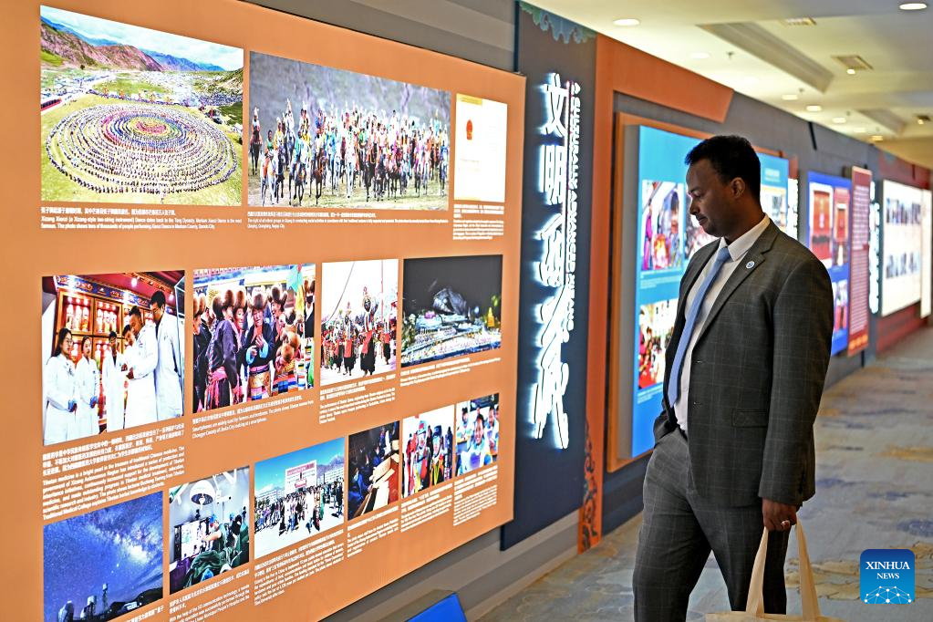 An attendee views an exhibition outside the venue of the "2023 Forum on the Development of Xizang, China" in Beijing, capital of China, May 23, 2023. A forum on the development of Tibet was held on Tuesday in Beijing to pool wisdom for the continued development of the autonomous region in southwest China. (Xinhua/Li Xin)