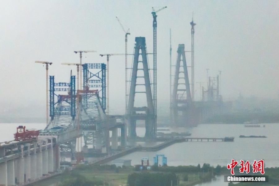 Photo shows the construction site at the Changtai Yangtze River Bridge in Changzhou, east China's Jiangsu Province, May 22, 2023. (Photo: China News Service/Yang Bo)