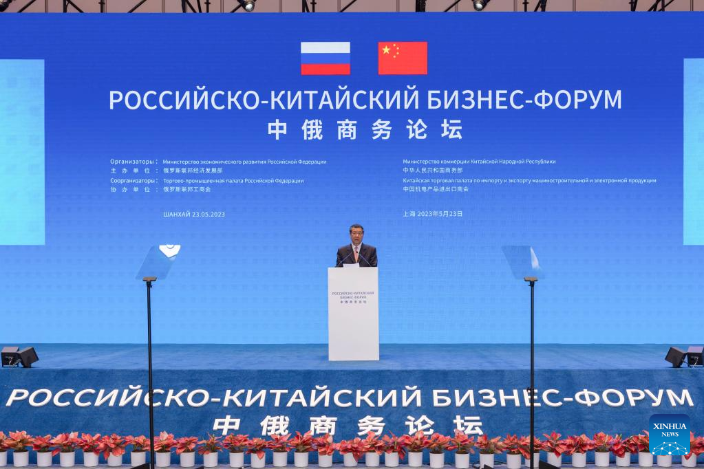 SHANGHAI, May 23 (Xinhua) -- Chinese Vice Premier He Lifeng attended the China-Russia business forum on Tuesday in Shanghai, expressing expectations for in-depth exchanges between Chinese and Russian business communities.