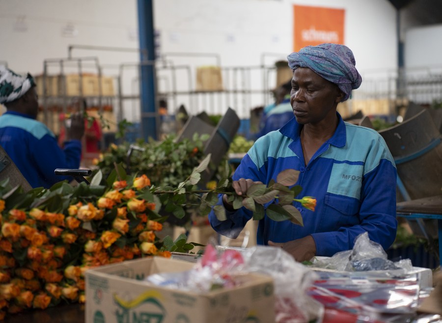 A staff member processes cut flowers at a flower farm in Naivasha, Kenya, Feb. 8, 2023. (Xinhua/Li Yahui)