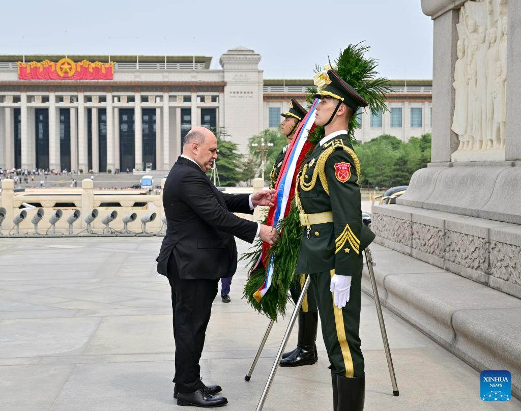 Prime Minister of the Russian Federation Mikhail Mishustin lays a wreath at the Monument to the People's Heroes at Tian'anmen Square in Beijing, capital of China, May 24, 2023. (Xinhua/Yue Yuewei)